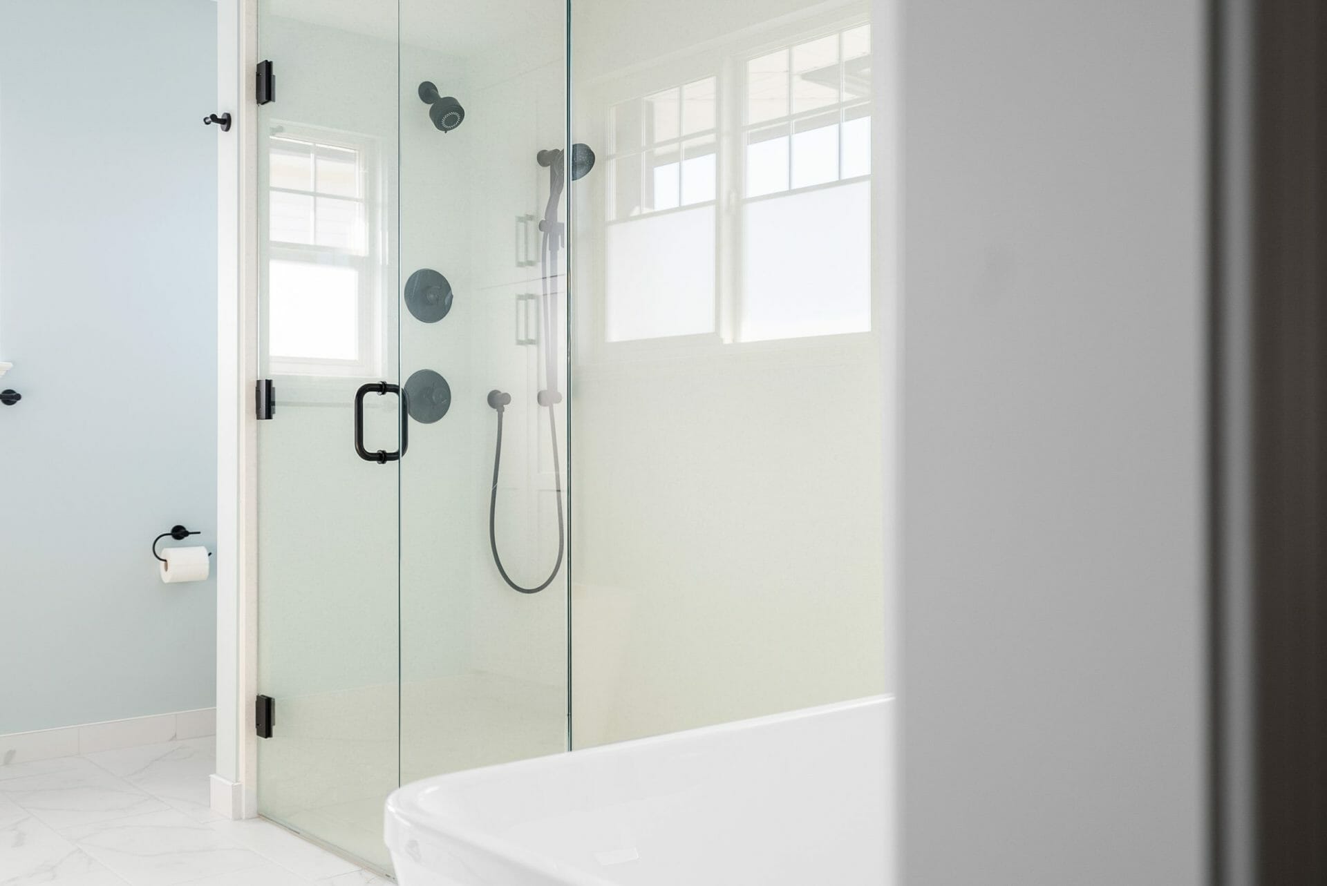 This beautifully reimagined primary ensuite was designed with a layout that seamlessly accommodates a spacious soaker tub and a custom walk-in shower. Featuring double sinks and ample room for two to move comfortably, the bathroom renovation transforms busy mornings into a harmonious experience, ensuring everyone has their own space to prepare for the day.