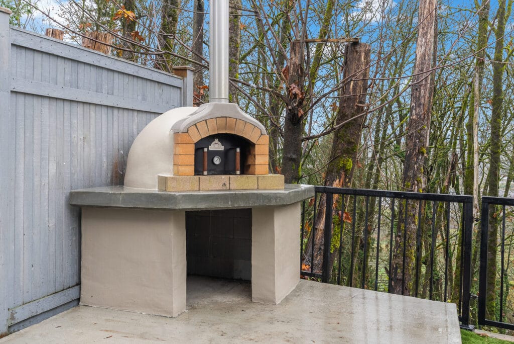 A large island with generous seating anchors the space, offering room for prep, casual dining, and lively conversation. An outdoor extension featuring a custom-built pizza oven adds a unique focal point, perfect for hosting gatherings and sharing meals with friends. Inside, the mudroom was redesigned to include a butler’s pantry with abundant storage, relocated laundry, and space for an additional refrigerator—ensuring the main kitchen remains open and uncluttered.